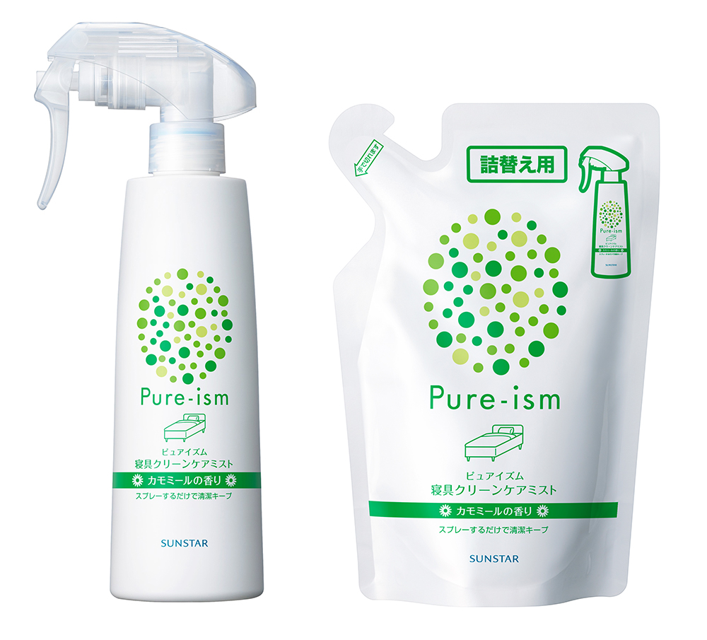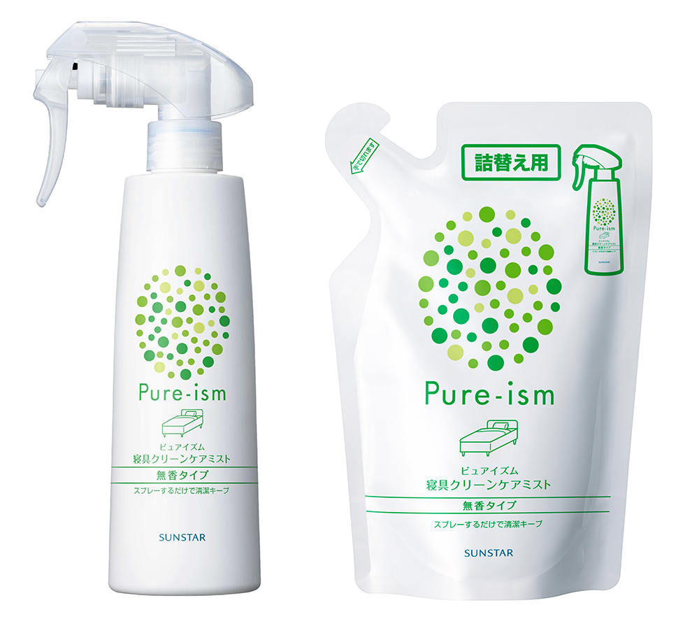「ピュアイズム寝具クリーンケアミスト」寝具の衛生維持のための商品です。シュッとスプレーするだけで、ダニを寄せつけず、ダニのフンや死がい、花粉などを包み込んでブロックします。天日干しできなかった日や、お休み前の寝具ケアに便利です。